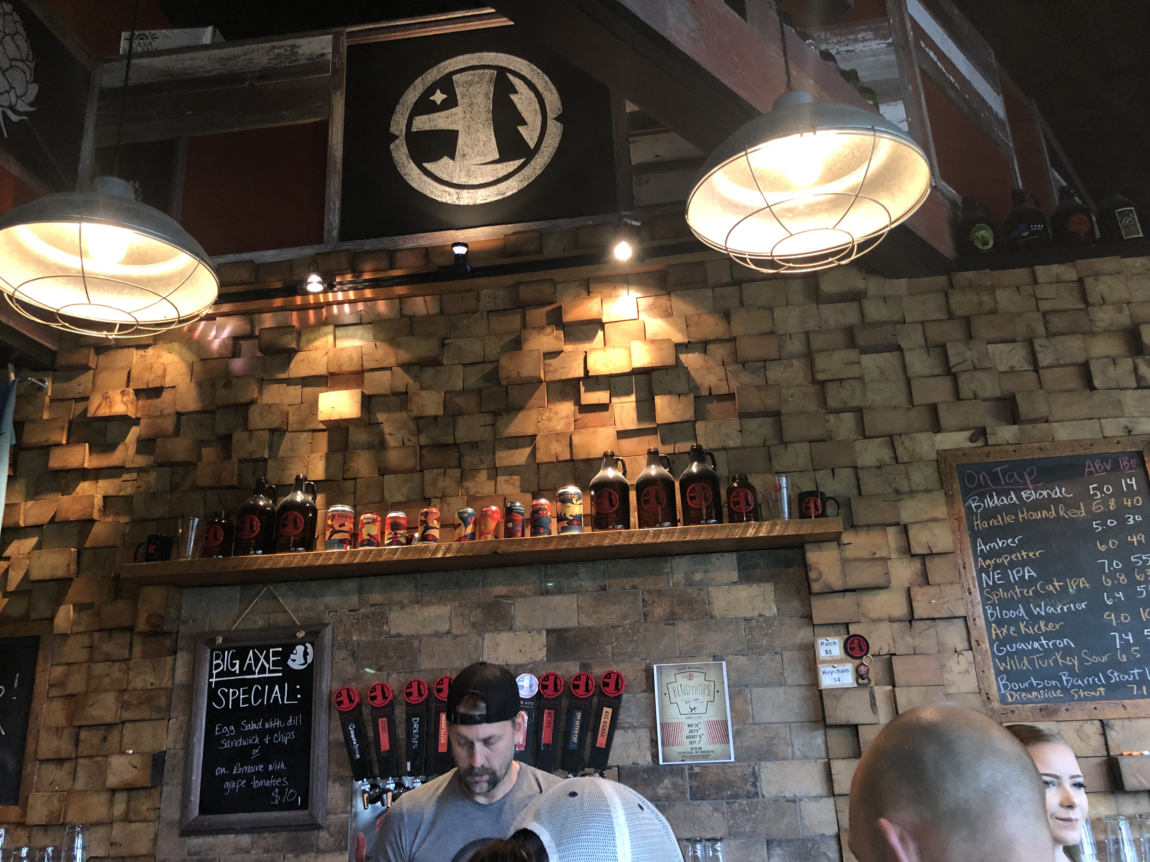 Local artist Joe Anderson has played a large role in the artwork and design features that are a part of Big Axe. “The logo design was a really cool process,” Chris explains. “We went through a few designers before Joe finally nailed down that logo, which I really like a lot. It captures our idea and branding, it showcases exactly what we wanted to showcase, and it ties into the area really well with the axe, the trees, the star, and the lake. Much of the credit for the tap room design should go to two people. My wife and our carpenter, Andy. Andy provided a lot of input into it. If you look at that supporting structure it says AXE up there. It was a great idea and gets a lot of attention and acknowledgement from our customers. Our goal for the space was to have a combination of industrial and rustic style blended together, which I think we did. We have the industrial side with the brewery operation and the concrete countertop, and a rustic aspect with the reclaimed wood feature wall and the other darker wood surfaces. We did have some additional input provided by a local designer, but the bulk was from my wife and Andy.”